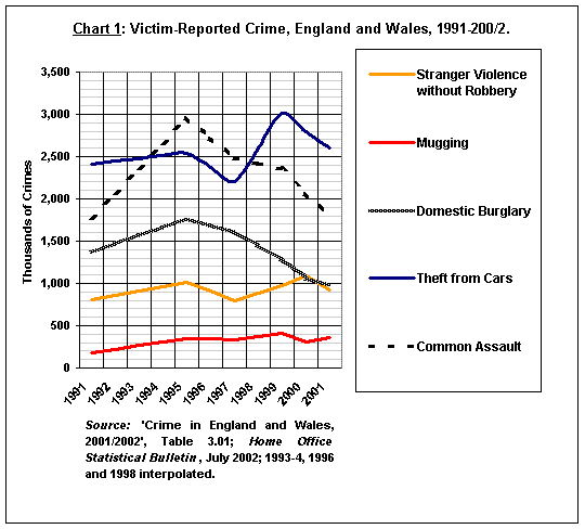 The BCS (ie Victim-Reported) data are much more reliable because they don't suffer the above-described problem and also include some, but not all actual crimes which for one reason or another have not been reported to the police. Unfortunately, the BCS report is necessarily about nine months in arrears. The recent publication in July gave annual figures relating to the period corresponding to the financial year 2001/2, i.e. figures that indicate the general situation around November last. By contrast, Scotland Yard has kindly provided me with our police district's detailed Recorded crime data on a month-to-month basis up to last April. So lets start by looking at some BCS national figures and then, with caution, at the more recent Recorded figures. (See Chart 1.)