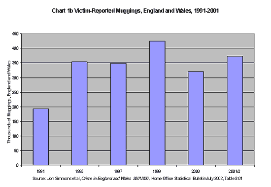 At the beginning of the decade 1990-2000 the chance of being mugged in any given year for the average member of the adult population was around one in two hundred. By the end of the decade that risk had doubled (i.e. became one in a hundred). Between 1999 and 2000 the figure fell back sharply to a level halfway from where it had begun and then, unfortunately, in the next year, i.e. 2001/2002, rose again by enough to put as back to a situation where mugging is two thirds worse, nationally than it was in 1990. I think the Government is therefore absolutely right in giving high priority to this problem. My guess is that as a result we shall a see a major decline in 2002/3, with uncertainty thereafter.