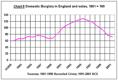 The Result in terms of Burglaries Chart 6 is a statistical series which 'splices' the police-recorded data before 1990 with the BCS data thereafter. I think that is a reasonably accurate procedure because there is indirect evidence of police under-recording of burglaries in the period 1990-1995 as they were, in effect, partly overwhelmed by the crime wave.