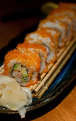 We settled into our seats and were presented with beautifully ornate menus with an extensive offering of food. Bear in mind that you won't find your tonkatsu (breaded fried pork loin) or chawanmushi (egg custard steamed in a tea bowl) here but what you will find is three or four pages of sushi, all prepared by hand by the lone sushi chef at the back of the dining room, along with a selection of bento boxes, noodles and other (limited) hot dishes. We opted for a handful of starters to share (chicken gyoza (dumplings), miso black cod, kani karaage, agedashe tofu (fried silken firm tofu, served in a special sauce), miso soup and a California maki (an Americanised sushi roll, with avocado, crab sticks and cucumber, rolled "inside-out" and covered in tobiko (flying fish roe))), followed by tempura udon (udon noodles in a hot broth with tempura prawns and vegetables) for myself and tempura zaru soba (cold soba noodles with a special sauce, served with tempura prawns and vegetables) for my companion for the evening, KM - another Japanese food aficionado.