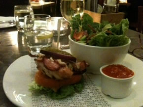 The mains included burgers (lamb, crab and lobster, or beef) at around £10, and the menu was a fairly typical selection similar to that found in most English pubs including fish and chips, steak, salmon fillet, curry or Pad Thai. Those mains range in price from around £8 - £15. I chose the chicken fillet burger which came wrapped in very thick bacon, served with salad and I chose to forego the bun. Celeriac remoulade was promised but its delivery took prompting and it was not terribly exciting, being smothered in mayonnaise. The chicken was a little dry and unappetitising but the bacon was very good, and the salad was fresh and varied. My friend chose the Salmon Teriyaki and Tiger Prawn salad served with roasted red peppers and fresh leaf salad. She described it as tasty "but definitely not Tiger Prawns".