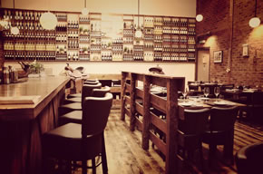 We visited on a warm spring Tuesday evening, and found the restaurant easy to locate by its ornate entrance with two steel-enclosed flames burning on the pavement. The restaurant is just off Turnham Green Terrace, on the site of a former night-club. As we stepped inside, we noted that even though it had open for only a week, most tables were occupied.