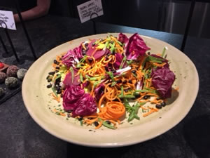 I opted for the salads- there are two daily options, and before long a generous portion of leaf and root was presented, with black beans, sliced beets, green beans, spiralised carrot and a green dressing made with avocado, cucumber, cashews, garlic and coriander. That was only one salad- the second, which we also sampled, was roasted tomato with home-made labnah ( a middle eastern curd cheese) on top. I also had some marinated chicken on top. The entire was light and healthy, yet satisfying and I felt very virtuous.