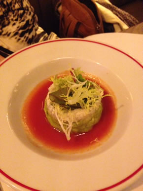 My starter was to be a Crab and Avocado dish - white crab mayonnaise with guacamole & spiced tomato juice, priced at £7.95. This was a little heavy on the mayo and less so on the crabmeat. It was wonderfully fresh to the palate. But the dish needed needed a spicy infusion, some heat to offset the mellowness of the avocado. The tomato soup swimming underneath might be the place for the chef to add a dash of something piquant like Cayenne pepper or some ground Coriander. My friend chose the Tomato and Basil soup, which came in a metal jug poured into a bowl over an aubergine & Mozzerella tortellini. She pronounced it "very nice by itself and it doesn't really need the piece of pasta."