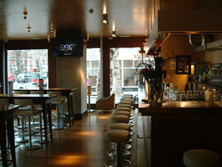 A dining area runs along the right hand side of the room and an abundance of high stools, tables and comfortable arm chairs fill the bar area.