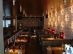 Crystal chandeliers adorn the L-shaped chrome bar behind which is a display of no less than 56 flavoured vodkas.
