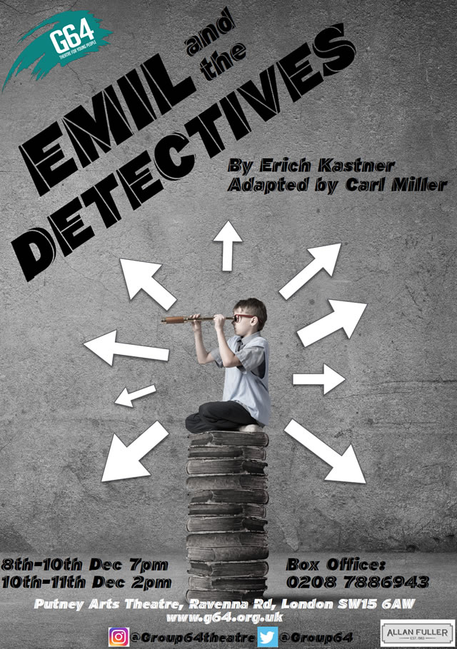 Group 64 Theatre for Young People present their Christmas show: Emil and The Detectives by Erich Kastner, adapted by Carl Miller. Performed by young people aged between 8-17 and directed by Kate Pasco, Youth Director of Group 64.