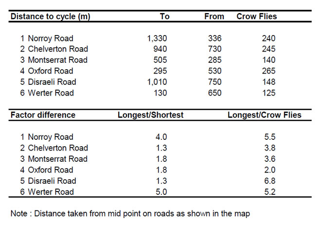 The table below the map estimates the distance of these journeys and shows that in some cases the outward and return journeys differ by a factor of up to 5. The table also compares the longest cycling journey with a “crow flies” distance and reveals that in the case of Disraeli Road the former may exceed the latter by a factor close to 7.