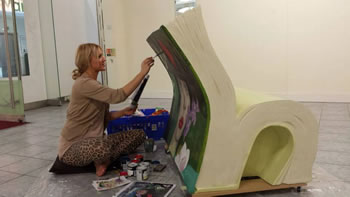 Regular visitors to Putney Exchange may have noticed strange goings on in the vacant shop opposite Waitrose. A glimpse through the window would show the shop had now become a working art studio with a mysterious blond painting away on a blank bench shaped mysteriously like a folded book.