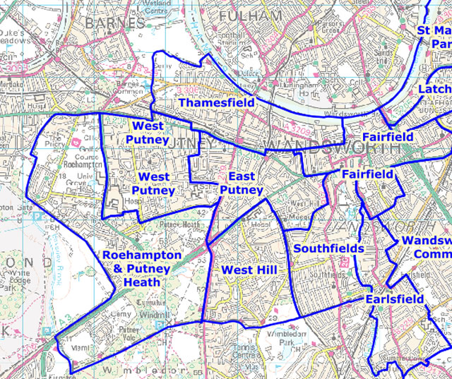 Current ward boundaries for Putney within Wandsworth Council.