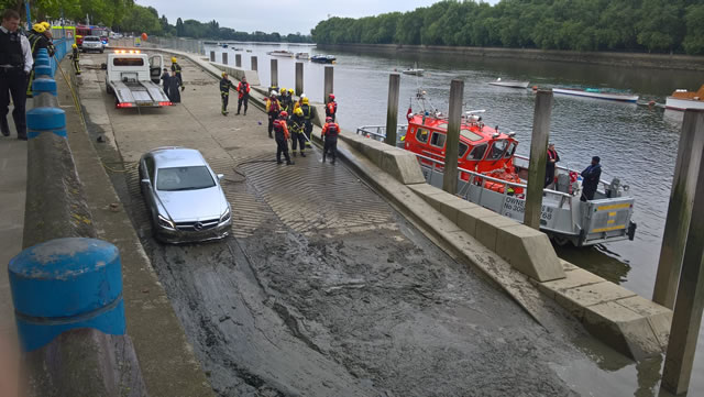 Firefighters were called to a car stuck on mud at Embankment, Putney on 8th June at 5.50am after the vehicle had driven down a slipway at Putney Pier and became stuck in one foot of mud - it was back up on the road and fire fighters had left the scene before 7am.