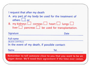 The Donor Card enables people to express their wish to become an organ donor. It is like making a will. By signing the 'Donor Card' you have agreed to organ donation.