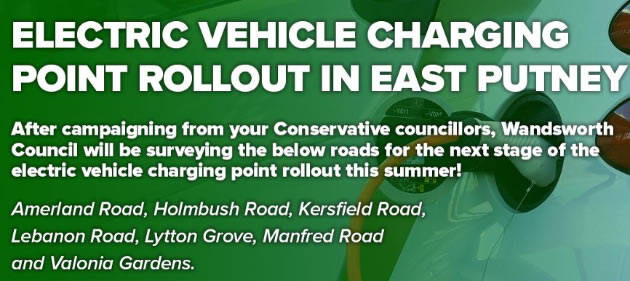 Electric vehicle charging: We have been campaigning for more East Putney electric vehicle charging points, and are pleased that seven of our roads are being surveyed for a roll-out of more this summer.
