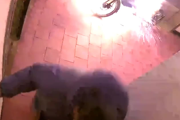 The film shows the bike apparently left in a communal are of a building. A man in the footage appears to be about to enter one of the flats when his attention is attracted by the bike from which smoke is starting to emerge.
