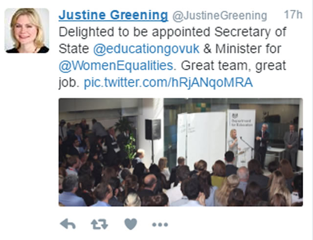 Theresa May has appointed Justine Greening to education Secretary replacing Nicky Morgan. Her brief 'to ensure everyone gets the best start in life.'
