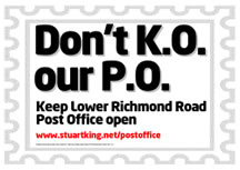 Those are the reasons I’ve launched the campaign to save this post office – you can find out more at www.stuartking.net/postoffice. If you’re in the area surrounding the Lower Richmond Road post office you’ll be hearing from me soon with ways to get involved and help stop this K.O. of our P.O. – but I’d welcome your support where ever you live and whichever political party you vote for: this isn’t a party political issue.