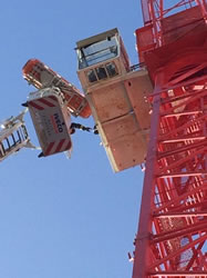 Station Manager Bruce Grain who took part in the rescue said: "The crane's cab was high up, about a hundred feet off the ground and gusts of wind made the rescue very challenging. The cab was just within reach of the ladder platform at its maximum height, so firefighters were able to reach it without using ropes. There was very little room in the cab, which made treating the man and strapping him into the stretcher difficult, but he was lowered quickly and safely to the ground."