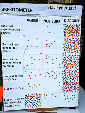 Over 100 respondents shared their views on the current situation and what they think should happens next on Brexit. People cast their ‘vote’ by placing a coloured sticker in their chosen column on the chart.