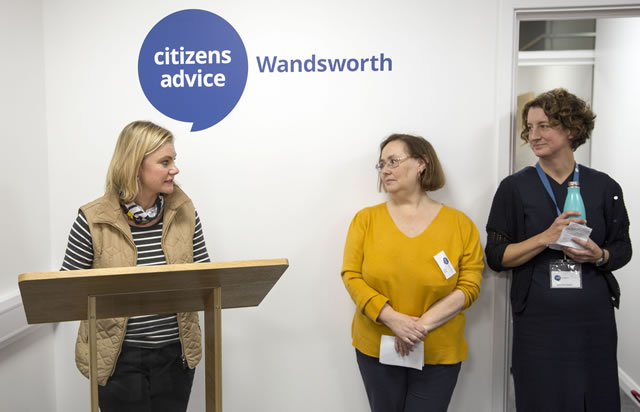 Justine Greening MP at the opening event of the Roehampton Advice Centre with Lucy Harmer, Chair of trustees of CAW (centre) and Mary-Ann Foxwell