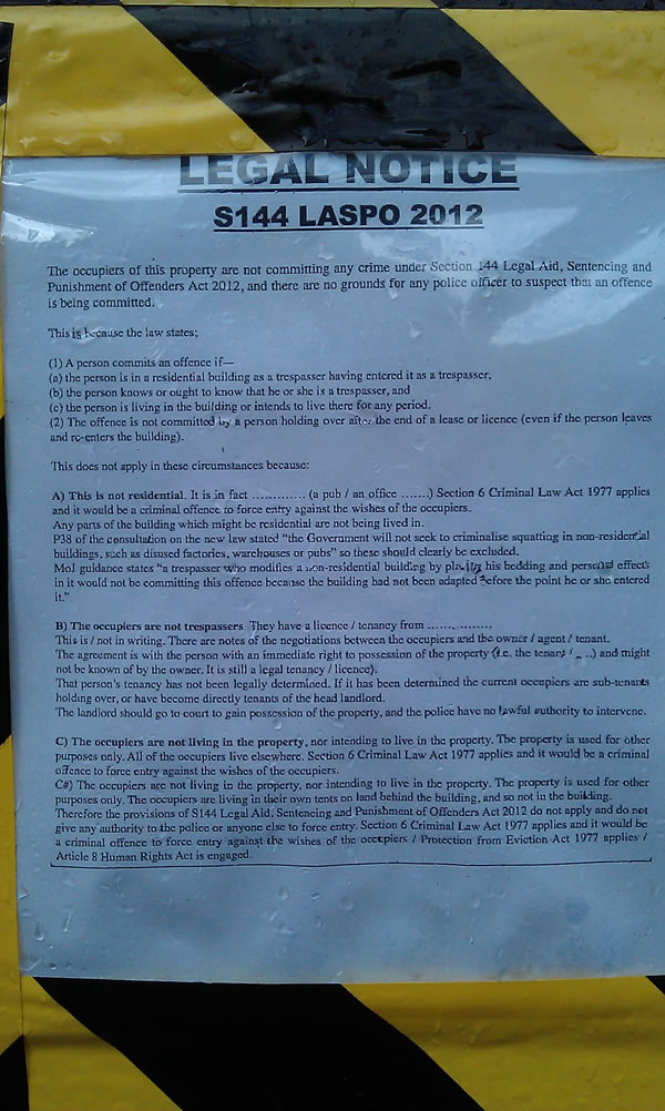 The group of "non squatters" have backed this up with a S1449 legal notice outside the building: