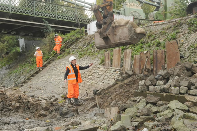 PLA team working on revetment by Hammersmith Bridge, Barnes