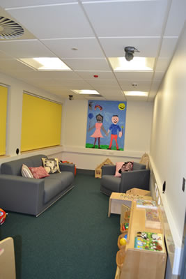 The suite, which includes three interview rooms (see picture above), two waiting rooms and a kitchen area, has been created with the assistance of the Bright Horizons Foundation for Children. The area is designed to be an engaging, comfortable place where children and families in crisis can relax and includes books, games, toys, art supplies and computers for children of all ages.
