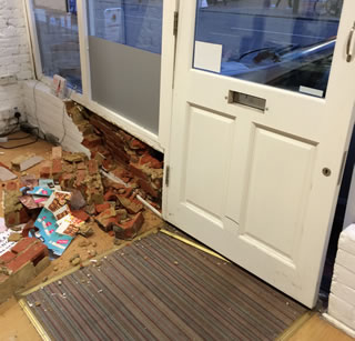 The impact as the car 'bounced' along the shop front led to all the wooden framework and brickwork below the frames having to be replaced although amazingly all but one pane of glass remained in tact.