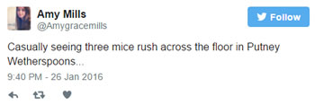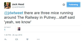 It became apparent that The Railway on the Upper Richmond Road had three unwanted guests on Tuesday (26th January) evening when two paying punters tweeted that they had seen three mice in the pub and, according to one tweet, staff appeared unperturbed.