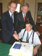 From left to right is Simon Brewer, Peter Franklyn (Chief Executive of the Royal Hospital for Neuro-Disabilities) and Tony Bagley (a resident at the hospital) | |