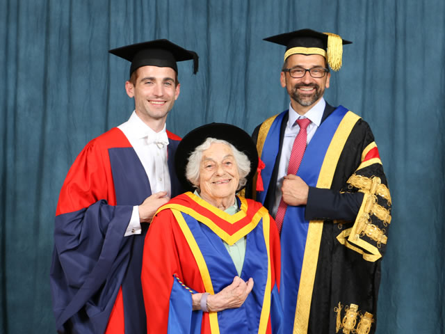 Vera Schaufeld MBE, brought to England in 1939 by the Kindertransport rescue effort organised by the British humanitarian Sir Nicholas Winton, was awarded an honorary doctorate by the University of Roehampton on Monday, 29 July at a ceremony at the Festival Hall in London for her services to education.