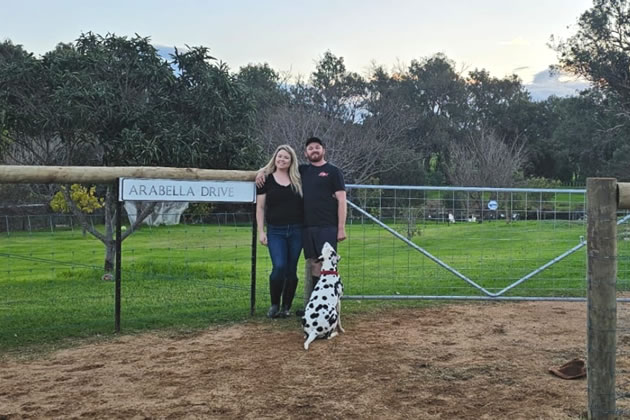 The sign now hangs on the gate of their newly purchased farm in the Margaret River region, where the couple plan to marry. Their Dalmatian, Sky, has already made herself at home.