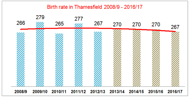 According to the FoPC the birth rate pattern is similar in adjacent wards with with practically no rise in the birth rate between 2008/9 and 2016/17.