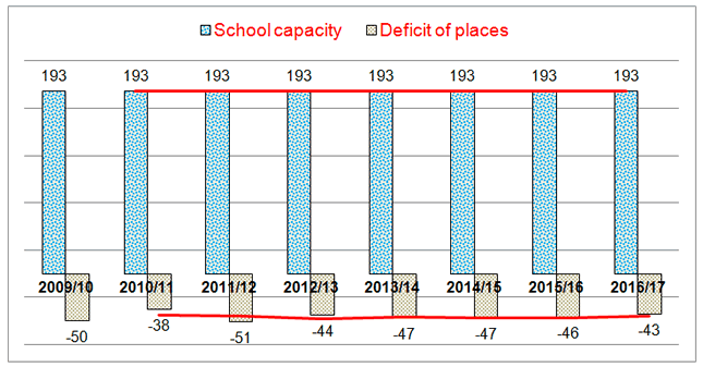 The chart above shows school capacity is constant, as is the deficit. Local primaries have always had high waiting lists but still managed to provide sufficient places. The Council’s Policy Paper 23-213 says