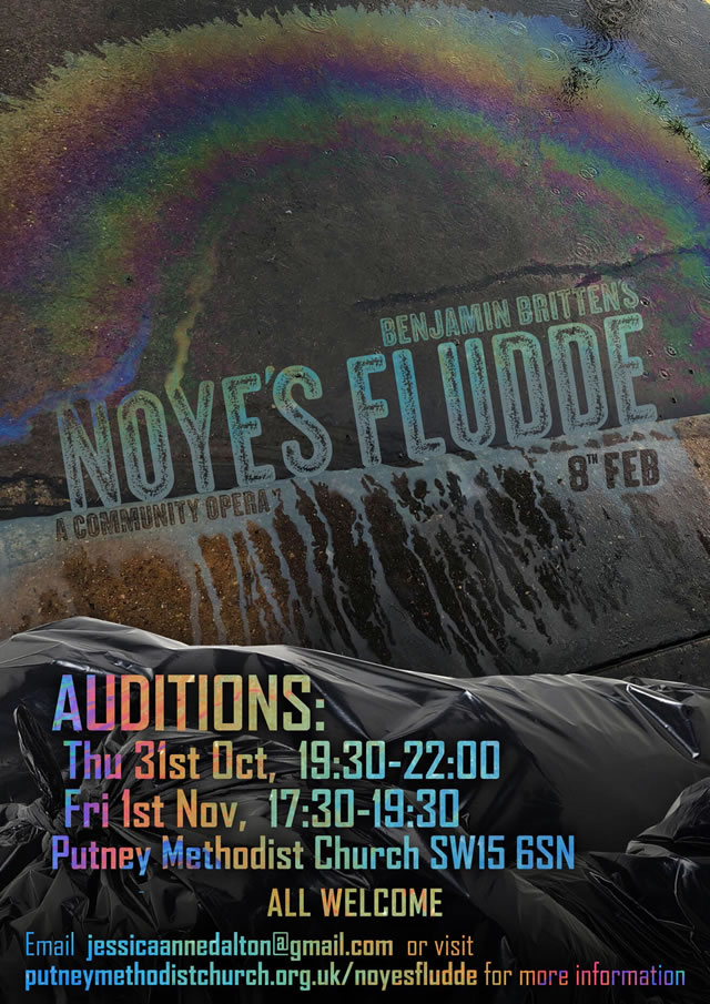 Auditions are Thursday 31 October 7.30 to 10 PM and Friday 1 November 5.30 to 7:30 PM for two performances on 8th February at Putney Methodist Church, Gwendolen Avenue, SW15 6SN.