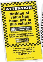On Saturday 12th April 2008 East Putney Safer Neighbourhoods Team held three very successful street meetings dedicated to motor vehicle crime prevention. They were held at three different locations across the entire ward in order to provide all residents the opportunity to speak to our team. At each meeting we distributed laminated vehicle crime prevention cards stating "Nothing of value has been left in this vehicle" and other associated literature. The card also gives valuable advice in the form of an easy to read checklist on the rear of the card.
