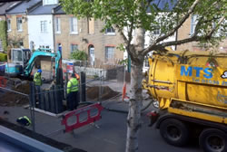 When a hole unexpectedly appeared in Sefton Street, residents were initially relieved when Thames Water appeared. The hole was enlarged and deepened to access the broken sewer pipe and a metal sheet was left covering it ensuring residents could pass over on foot or by car safely.