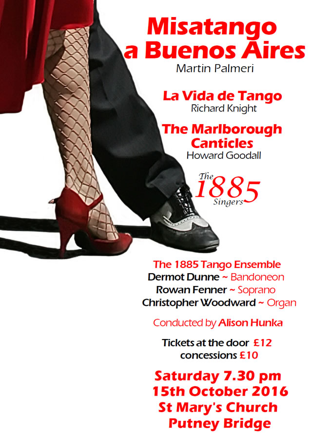 The 1885 Singers are singing a wonderful programme inspired by the Argentinian Tango in St Mary's Church Putney Bridge at 7.30 on the 15th October.