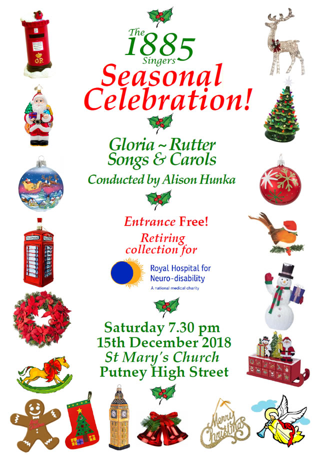 The 1885 Singers are performing a jolly seasonal concert of delightful carols and songs, at ST Mary's Church Putney High Street at 7.30pm on Saturday 15th December.