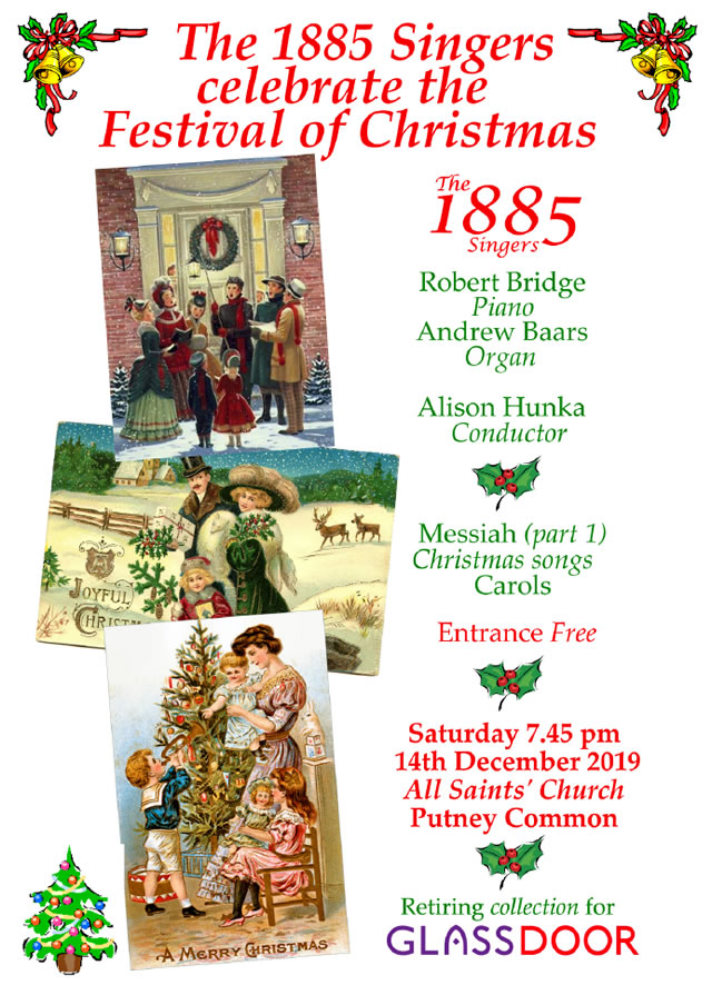 On Saturday 14th December 7.45pm at All Saints Church. Putney Common, the 1885 Singers bring you a programme of Festive Carols and Songs and Messiah part 1 to set your heart and mind in the Christmas mood.