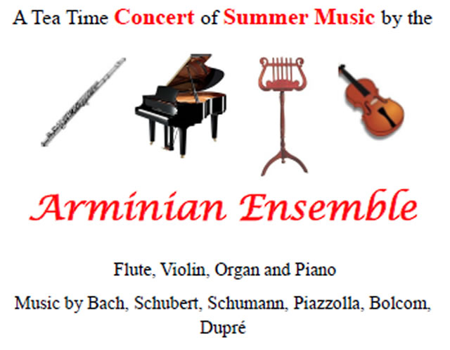 A concert of Summer music for flute, violin, organ and piano by the Arminian Ensemble on Saturday 13 July at 3pm at the Putney Methodist Church,
