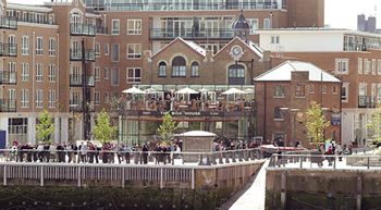 The pub is on three floors, facing a riverside piazza, and