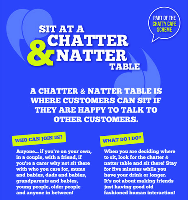 The Chatty Café Scheme encourages cafes to have a 'Chatter & Natter' table which is where customers can sit if they are happy to talk to other customers. A Chatter & Natter table is for anyone... if a person is on their own, in a couple, with friends, if someone is a carer they could sit there with who they care for, people with babies, professionals, young people, older people and anyone in between!