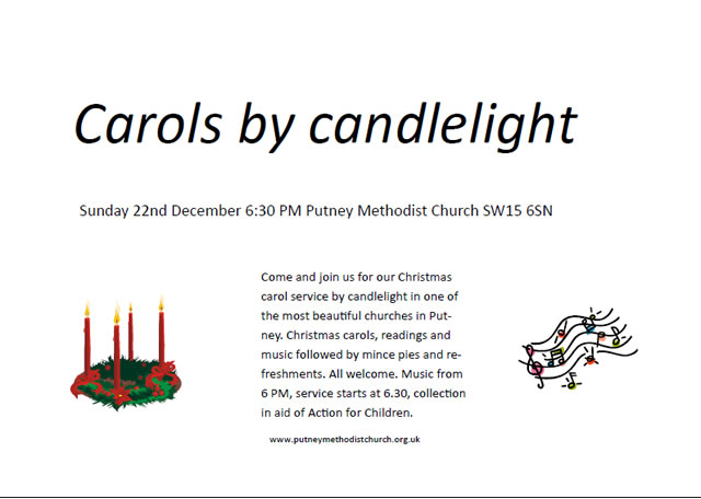 Christmas Carol service by candlelight in one of the most beautiful churches in Putney. Christmas carols, readings and music followed by mince pies and refreshments. All are welcome. Music from 6 PM, service starts at 6.30, collection in aid of Action for Children."