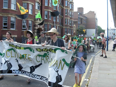Hundreds of people have been and will be taking part in an incredible seven day journey across London, in a quest for a live able future. From the "malignant growth" of Heathrow airport, participants in the Climate Caravan will walk and cycle eastwards, converging on the Camp for Climate Action at Kingsnorth power station in Kent. Here the owners, E.ON, in collusion with the government, have "disastrous plans to build the UK's first new coal-fired power station in 30 years".