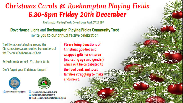 Following the resounding success and fantastic attendance at last year’s event, the Doverhouse Lions* and Roehampton Playing Fields Community Trust+ are holding another Christmas carols community evening. This will take place at Roehampton Playing Fields, Doverhouse Road on Friday 20th December from 17.30 to 20.00.