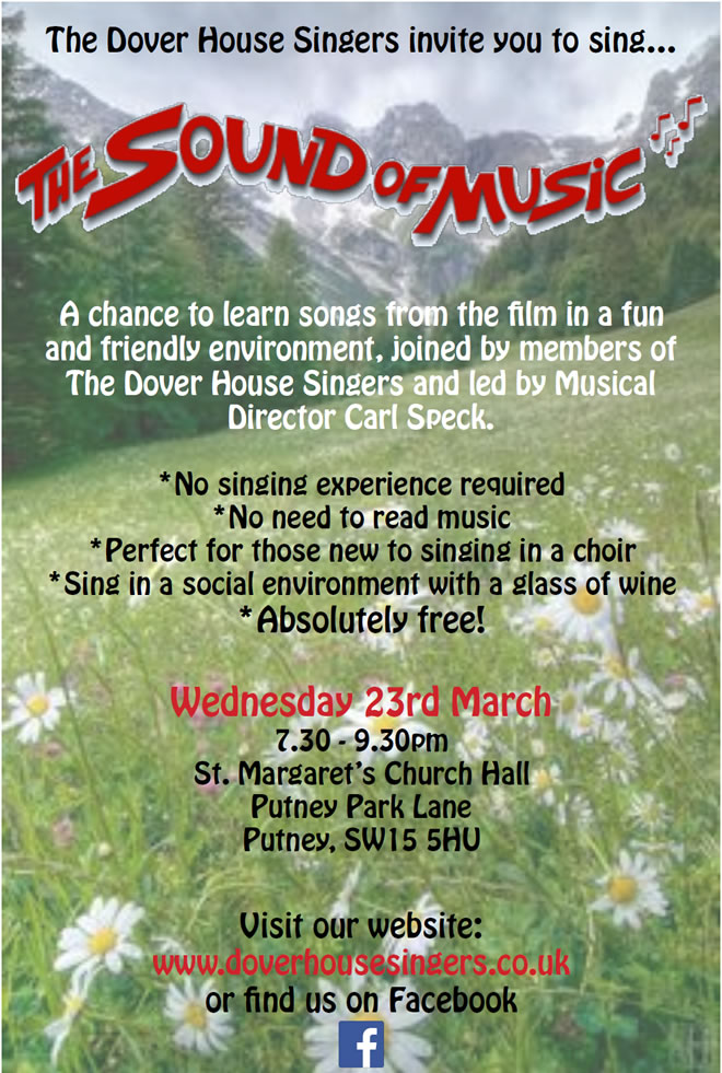 There will be a chance to learn songs from the Sound of Music in a fun and friendly environment, joined by members of The Dover House Singers and led by Musical Director Carl Speck on Thursday 23 March. The event takes place from 7.30-9.30pm at St. Margaret’s Church Hall Putney Park Lane Putney, SW15 5HU.