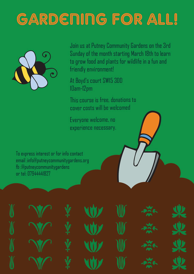 Starting on the 18 March Putney Community Gardens will be running a gardening course on the 3rd Sunday of the Month for 6 months skipping August. This course is intended for anyone whether they’re looking to support growing at Putney Community Gardens or hoping to pick up some tricks for their allotments, balconies, windowsills, or are just curious!