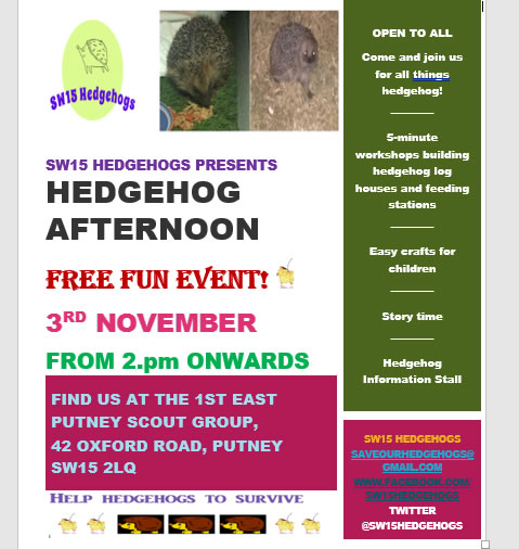 SW15 Hedgehogs give community and school talks, hold a weekly information stall and attend local events where possible such as Wimbledon and Putney Commons Open Day and school fates, all in t e hope we can get the message across that hedgehogs need are help. On Saturday 3rd November we are holding our first 'Hedgehog Afternoon' for local people as a fun way to learn all things hedgehog.