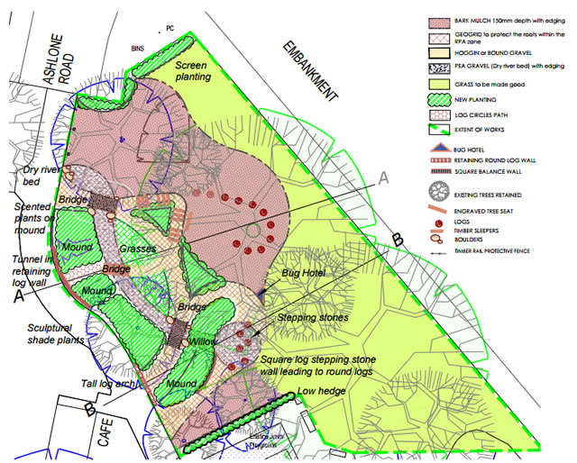 The new ‘natural play garden’ would be built into the landscape and feature mounds, bridges, a dry river bed, a bug hotel, log stepping stones and a balance wall. Shrubs, grasses and scented plants would be used to create natural barriers dividing the garden into different play zones.