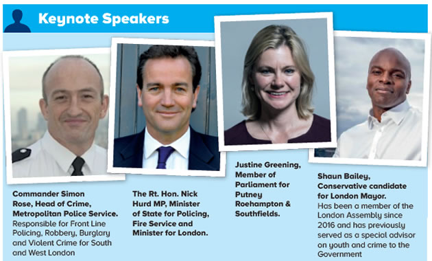 The speakers include Commander Simon Rose, Head of Crime, Metropolitan Police, responsible for front line policing, robbery, burglary and violent crime for South and West London, The Rt Hon, Nick Hurd, Minister for Policing, Fire Service and Minister for London, Shaun Bailey, Conservative candidate for London Mayor and member of the London Assembly.